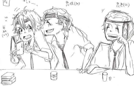 忠佐「おい!平助!隠気臭いな!!こっち向け!もっと飲めよお!」